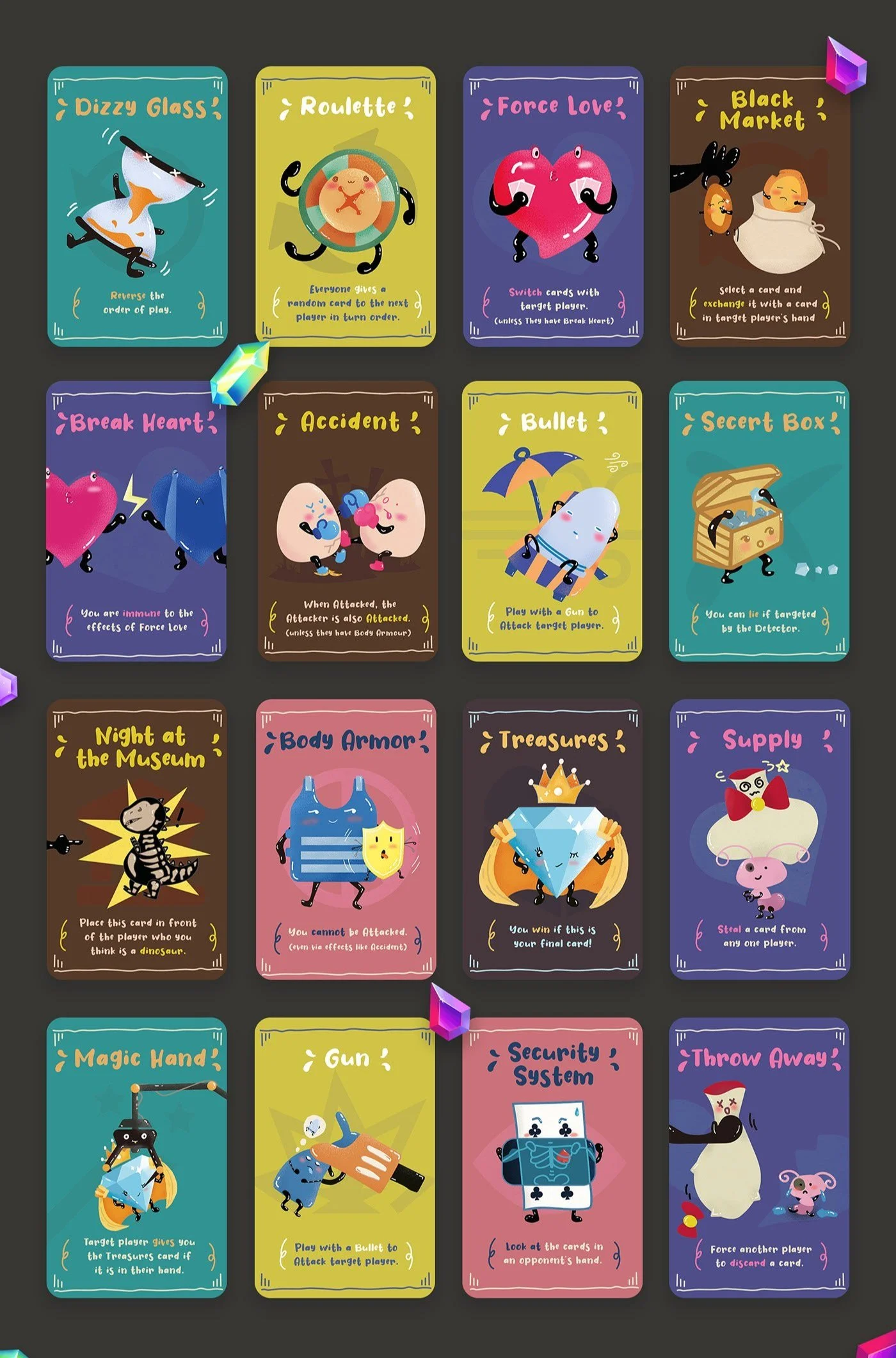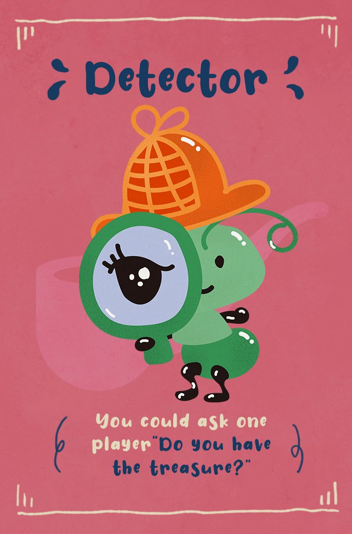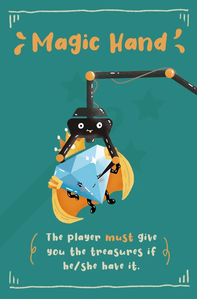 The "Detector" card allows players to ask other player “Do you have the treasure?”, encouraging strategic moves and counterplays. The "Magic Hand" card allows players to directly steal the opponent's treasure, adding an element of surprise and strategy.