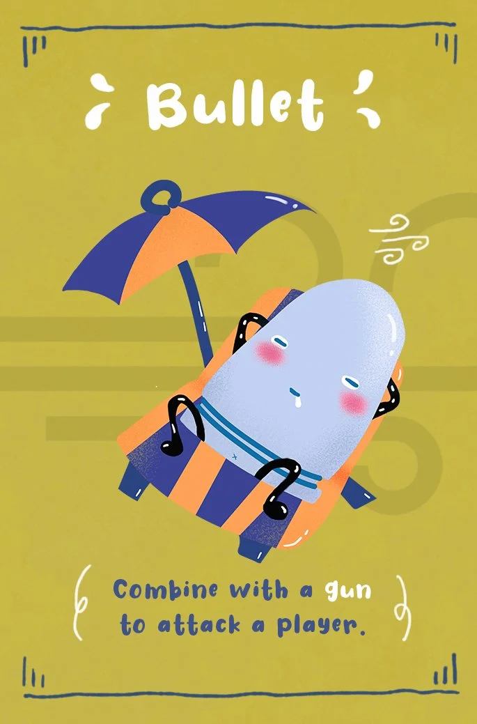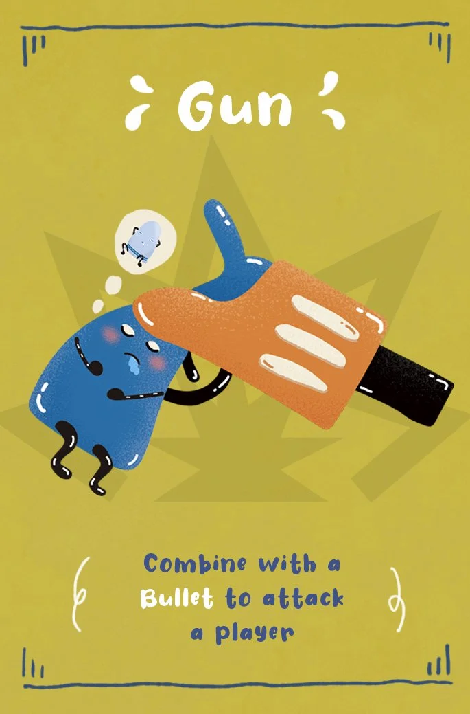 For instance, we modified the game mechanics so that instead of a single card being able to attack, the "Gun" card must be paired with a "Bullet" card to perform an attack, adding layers of strategy